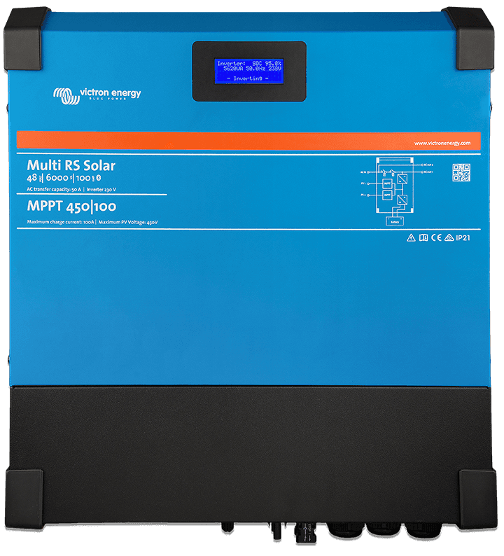 De Multi RS Solar is de nieuwste omvormer van Victron welke een 6000VA omvormer (5000W) combineert met een 450/100 Smartsolar laadregelaar. Je ontvangt een losse Cerbo GX bij deze omvormer (besturingssysteem).
